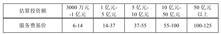 服務(wù)費(fèi)基價(jià)根據(jù)估算投資額在相對(duì)應(yīng)的區(qū)間內(nèi)用插入法計(jì)算,如下表所示(單位:萬(wàn)元)?